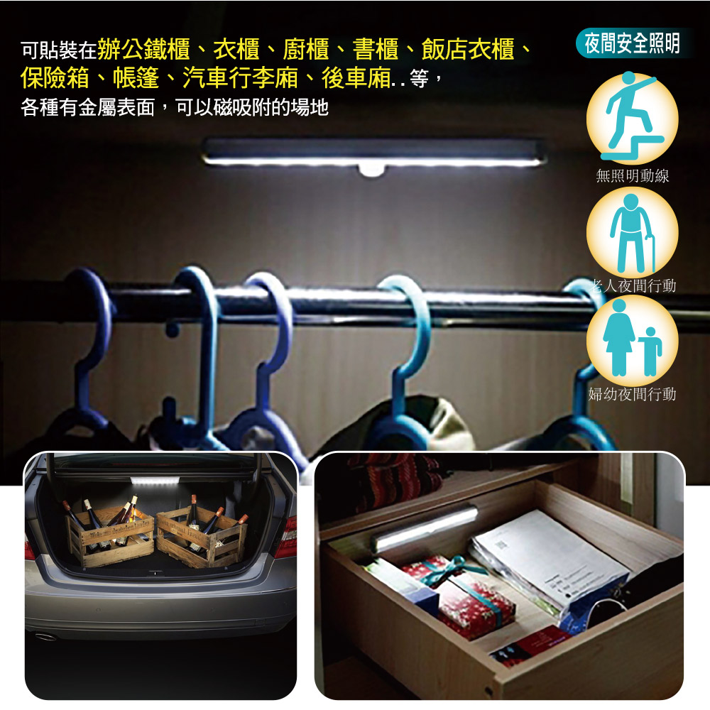 磁吸隨處貼,隨處可使用; 它適用吸附在各式鐵櫃, 也非常適合長期固定貼在需要間歇照明的地方。